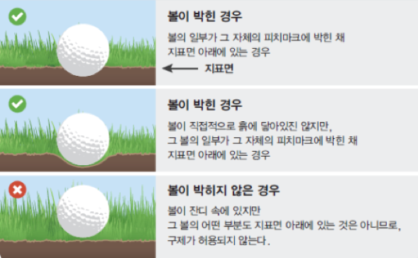 그렇다면 ‘박힌 볼’의 범위는 어디일까요? USGA 및 대한골프 협회에서는 박힌 볼의 범위에 대해서 상세하게 설명하고 있습니다.