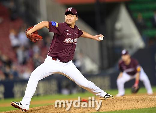 [마이데일리 = 김성진 기자] 키움 오주원이 10일 오후 서울 잠실야구장에서 진행된 '2019 신한은행 MY CAR KBO 포스트시즌' 키움 히어로즈와 LG 트윈스의 준플레이오프 4차전 경기 9회말 마운드에 올라 역투하고 있다.- ⓒ마이데일리(www.mydaily.co.kr). 무단전재&재배포 금지 -