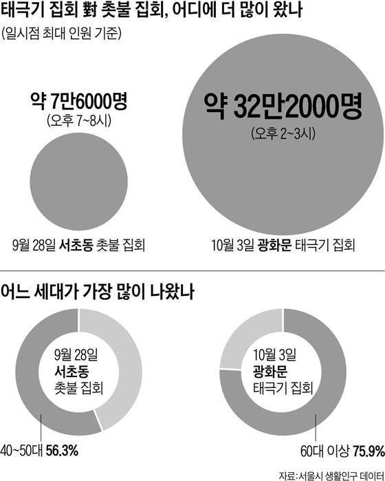휴대전화 접속 데이터를 통해 연령대별로 집회에 얼마나 왔는지도 파악할 수 있다. 9월 28일 서초동 촛불 집회의 경우엔 40~50대가 전체의 56.3%로 가장 많았고, 20~30대는 19%였다. 1주일 뒤 열린 촛불 집회 구성비도 비슷했다. 10월 3일 광화문 태극기 집회는 60대 이상의 참가 비율이 75.9%로 압도적이었다. 그 뒤를 이어 40~50대 비중이 19.8%, 20~30대는 3.6%였다. 두 집회 모두 10대의 비중은 10% 미만으로 적었다.