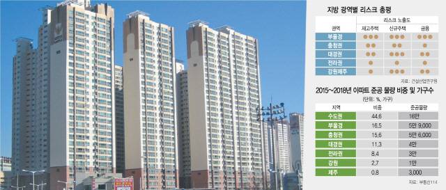 ◇‘리스크 최다’ 부울경···대구·경북도 위험 = 2015년부터 전반적인 주택 경기 불황이 시작된 부울경 지역은 여전히 전국에서 가장 심각한 리스크를 안고 있다는 진단이다. 미분양 물량이 많은데다 신규 시장에서도 리스크가 크다. 경남은 기존 아파트의 매매가가 가장 급격하게 추락하고 있다. 한국감정원 아파트 실거래가격 지수로 보면 경남은 2014년 고점 대비 집값이 무려 21.1%나 빠졌다. 울산은 17.8%, 부산은 10.1%가 하락했다. 미분양 문제도 심각하다. 2015년 하반기부터 미분양 증가 폭이 커졌고 9월 현재 부울경 지역의 미분양은 2만 가구를 넘어섰다. 특히 이중 경남에 몰린 미분양이 1만 4,000가구에 달한다. 금융위기 당시 최대치였던 1만 8,000여가구의 80% 수준까지 오른 수준이다.