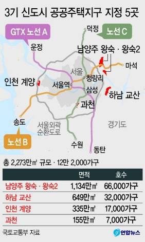 이번 공공주택지구 지정 지역은 지난해 12월 부동산 안정 대책의 하나로 발표한 '3기 신도시 조성 예정 지역'으로 계획상 총 12만2000가구를 지을 수 있는 땅이다.