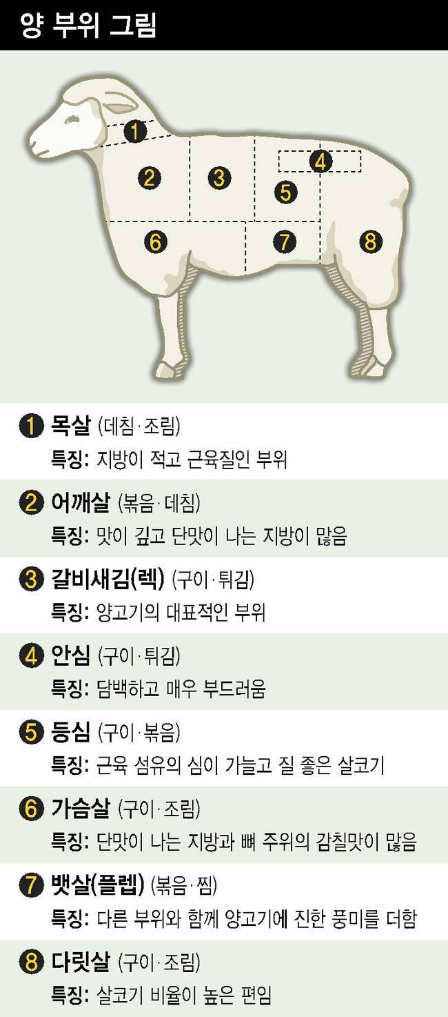 미식은 이제 문화다. 심지어 트렌드를 이끄는 콘텐츠가 된 지 오래다. 모임에서 메뉴의 유래나 식재료에 대해 이런 저런 얘기를 나누는 것은 큰 즐거움이다. 식도락가가 늘면서 외식업체 메뉴도 다양해지고 있다. 고깃집도 그 변화의 한가운데 있다. 최근 양고기 전문점이 부쩍 늘었다. 하지만 우리가 양고기에 대해 아는 바는 적다. 국내에는 양고기 전문 축산 농가가 거의 없다시피 하기 때문이다. 농촌진흥청에도 현재 양고기 연구가는 없다. 제대로 알고 먹어야 더 맛있는 법이다. 양고기 궁금증을 총정리했다. 콘래드 서울 ‘아트리오’의 황지훈 셰프, 오스트레일리아축산공사 등의 도움을 받았다. <풍미사전>·<음식과 요리> 등도 참고했다.