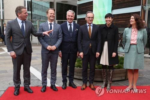 epa07927311 (L-R) Icelandic Foreign Minister Gudlaugur Thor Thordarson, Danish Foreign Minister Jeppe Kofod, Finnish Foreign Minister Pekka Haavisto, German Foreign Minister Heiko Maas, Norwegian Foreign Minister Ine Marie Eriksen Soreide, and Swedish Foreign Minister Ann Linde arrive at the Nordic Embassies during the missions' 20th anniversary celebrations, in Berlin, Germany, 17 October 2019. The Nordic Embassies, located in a common building complex designed by architects Alfred Berger and Tiina Parkkinen, are located near the Tiergarten park, where they opened in 1999. They contain the embassies, arranged geographically, of Denmark, Iceland, Norway, Sweden and Finland. EPA/ADAM BERRY