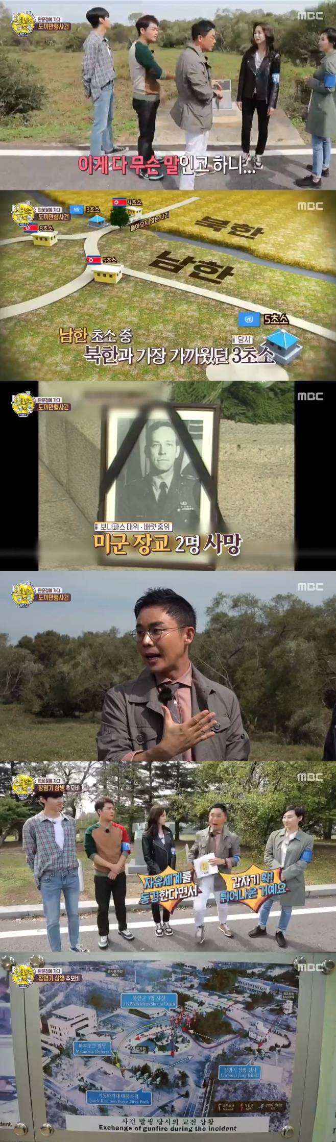 김지윤 박사는 "지금은 경계선이 있지만 예전엔 비교적 자유롭게 왕래가 가능했다. 남북 군인들이 함께 사진을 찍기도 했다"고 해 놀라움을 자아냈다. 이어 설민석은 "판문점은 다른 군사분계선과 달리 서로 왕래가 자유로웠지만, 1976년 비극의 날 이후 경계선이 형성됐다"며 판문점 도끼만행사건에 대해 설명했다.
