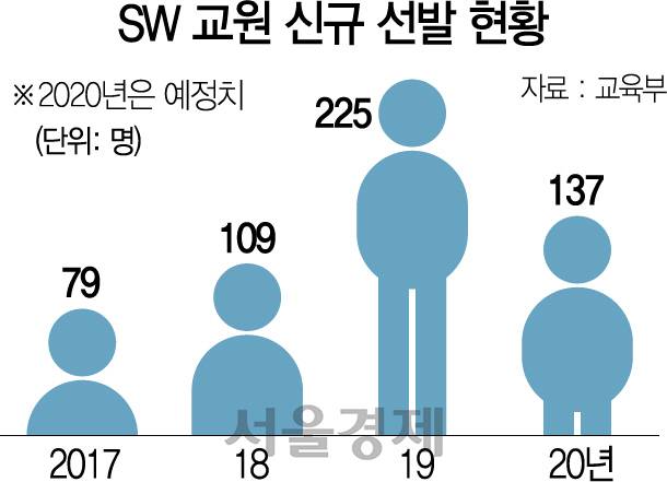 SW 교육 확대에 따른 교원 특수 역시 없어 한때 20여개에 달했던 사범대학 컴퓨터교육과는 현재 8개로 줄었고 한 해 모집인원도 학교당 30명이 최대로 전국에서 총 160명 수준이다. 서울에서는 2015년 고려대가 학과를 없앤 이래 성균관대 1곳만 운영된다. 한 임용고시 준비생은 “올해 서울·경기 100여명 등 총 225명을 뽑아 숨통이 트이는 듯 했지만 내년엔 서울·경기 60여명 등 137명으로 다시 줄어든다”며 “고교 교원의 확충 없이 SW교육을 설계한다는 게 이해되지 않는다”고 말했다.
