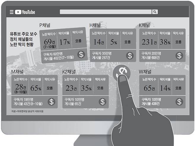 보수 유튜버들은 반발한다. 대표적 보수 유튜브 채널인 '최병묵의 팩트' 측은 "적어도 어떤 항목을 위반했는지 상세 설명이라도 있어야 한다"고 했다. 보수 진영에서는 "구글이 친문의 블랙리스트를 참조해 노란 딱지를 발부한다"는 주장도 나온다. 똑같은 정치 해설 영상에서도 '문재인' '더불어민주당' '조국' 등의 키워드가 들어간 영상만 집중 타깃이 된다는 이유에서다. 실제로 친문 네티즌 채팅방에서는 "○○채널에 대한 공격이 성공해 노란 딱지가 붙었다" 등 대화가 오간다.