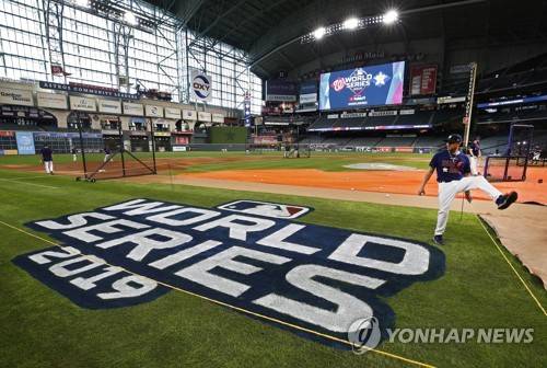 epa07939393 A Houston Astros player steps over the rope around the World Series log after picking up a baseball at batting practice during the 2019 MLB World Series Media Day at Minute Maid Park in Houston, Texas, USA, 21 October 2019. The American League Champion Houston Astros will play the National League Champion Washington Nationals in the 115th Fall Classic; World Series. The series is the best of seven games. EPA/LARRY W. SMITH