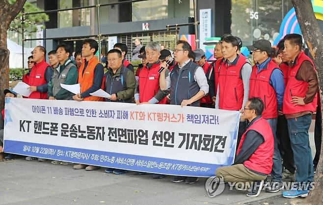 (서울=연합뉴스) 류영석 기자 = 22일 오전 서울 종로구 KT 광화문지사 앞에서 민주노총 서비스연맹 KT링커스운송지회 관계자 등이 KT 핸드폰 운송노동자 전면파업 선언 기자회견을 하고 있다.