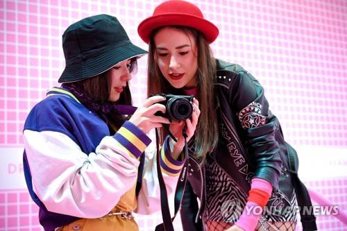 epa07948880 'JoanTwins' fashion bloggers Elena and Melina take pictures of each other as they visit the made-for-Instagram museum 'Cali Dreams' in Dusseldorf, Germany, 25 October 2019. No artworks are shown in this museum, rather each visitor himself becomes an artwork by staging himself in front of one of the 25 sceneries. Cali Dreams is initially open for three months. After this test phase, however, the museum is planned as a long-term project. EPA/SASCHA STEINBACH