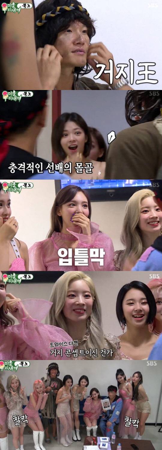 이날 김종국은 유세윤의 '시져시져' 무대를 함께 하기 위해 각설이로 변신했다. 김종국은 "마흔 넷에 이게 뭐야, '런닝맨'에서도 이런 거 안한다"며 좌절했다. 이때 대기실을 찾은 트와이스는 김종국의 모습을 보고 경악하면서도 단체 사진을 함께 촬영했다.