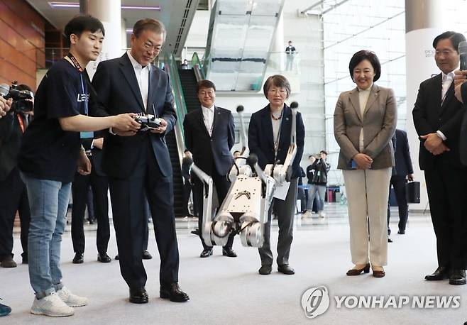 (서울=연합뉴스) 한상균 기자 = 문재인 대통령이 28일 오전 서울 강남구 코엑스에서 열린 인공지능 콘퍼런스 '데뷰(DEVIEW) 2019'에서 리모콘으로 4족보행 로봇 미니치타를 조종하고 있다. 로봇 미니치타는 이번 행사에서 국내 최초로 공개됐다. 2019.10.28