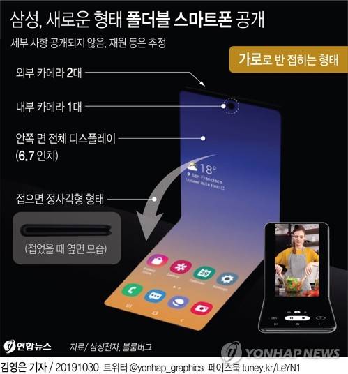 ![삼성전자가 가로로 반 접히는 새로운 폼팩터의 폴더블 스마트폰 디자인을 공개했다. [삼성전자 뉴스룸 동영상 캡처=연합뉴스]](https://img1.daumcdn.net/thumb/R658x0.q70/?fname=https://t1.daumcdn.net/news/201910/30/yonhap/20191030075537130zzgg.jpg)