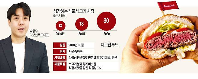박 대표는 “세계적으로 식물성 단백질로 만든 대체 고기가 채식주의자뿐 아니라 환경문제에 관심 있는 소비자들의 주목을 받고 있다”고 말했다. 디보션푸드는 소고기 분쇄육과 비슷한 맛과 식감을 가진 식물성 고기를 생산하는 스타트업(신생 벤처기업)이다. 1년 반 동안 연구개발을 거쳐 올 4월 실제 고기와 비슷한 식물성 고기 개발에 성공했다. 12월엔 식물성 고기 공장을 세워 프랜차이즈 식당 납품도 앞두고 있다.