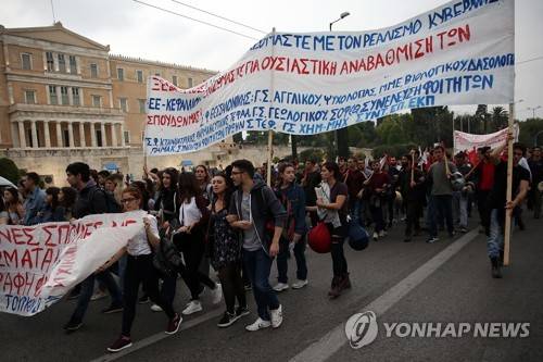epa07962519 Greek students shout slogans as they march in central Athens, Greece, 31 October 20?19. Greek students are protesting against reforms concerning the educational system. EPA/ORESTIS PANAGIOTOU
