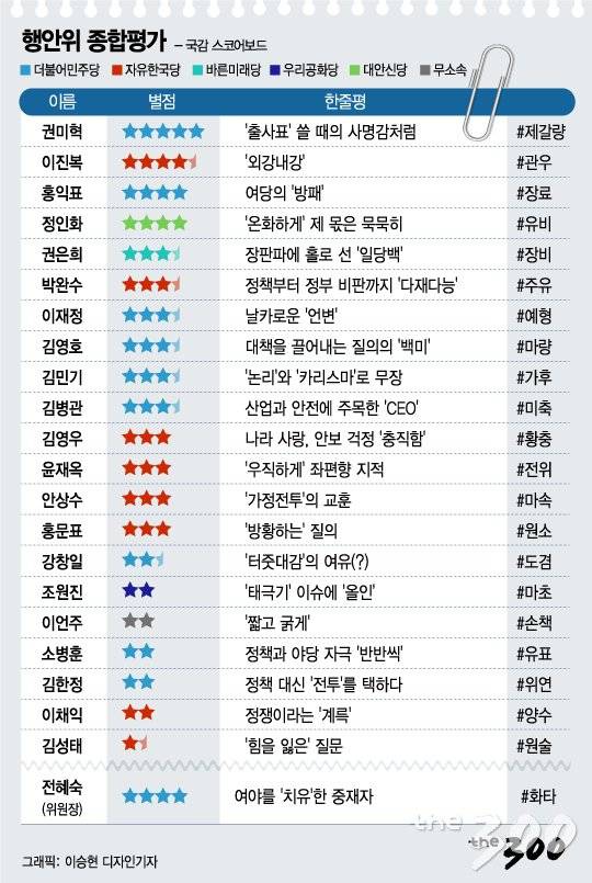 ◇'국민의 대표' 역할해낸 권미혁·이진복=권미혁 더불어민주당 의원은 이번 국감에서 국가가 과거에 국민을 상대로 저지른 폭력인 '선감학원' 문제 만큼은 본인이 매듭짓겠다는 각오로 임했다. 권 의원은 지난달 2일부터 24일까지 8번 평가가 이뤄진 머니투데이 더300(더300) 행안위 스코어보드에서 행안부, 경찰청, 중앙선거관리위원회·인사혁신처, 서울시, 경기도, 종합감사 등 6차례 1등을 했다.