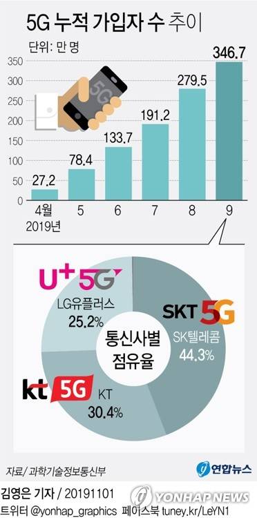 5G 가입자, 상용화 6개월 만에 346만명..SKT 점유율 44%