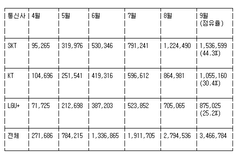 통신사별로는 SK텔레콤이 153만6천599명으로 전체의 44.3%를 차지했고, KT가 105만5천160명(30.4%), LG유플러스 87만5천25명(25.2%)으로 집계됐다.