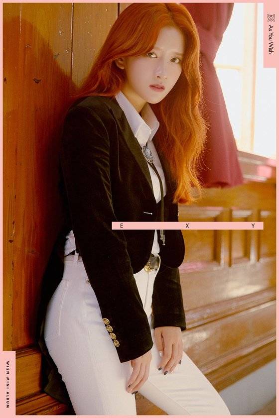 벽에 기댄 채 카리스마 넘치는 비주얼을 드러낸 엑시는 타오르는 듯한 붉은 색의 헤어 컬러로 강렬한 분위기를 가득 뿜어낸다. 또 승마복 패션을 완벽하게 소화하며 남다른 비율을 자랑한다.
