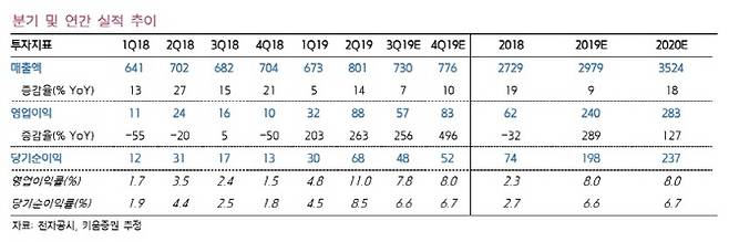 김상표 키움증권 연구원은 연우의 3분기 연결 매출액을 730억원, 영업이익을 57억원으로 추정했다. 이는 각각 전년 동기대비 7%, 256.3%씩 증가한 수치다. 김 연구원은 “인력 감원 및 물류창고 자동화 도입에 따라 인건비가 감소하고, 외주 효율화 등을 통해 큰 폭의 이익 개선이 가능할 것”이라고 내다봤다.