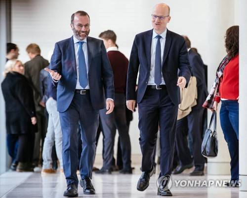 epa07974424 Leader of the European People's Party in the European Parliament Manfred Weber (L) and Christian Democratic Union (CDU) and Christian Social Union (CSU) faction chairman in the German parliament Bundestag Ralph Brinkhaus (R) talk prior to a faction meeting of the CDU and CSU Union at the German parliament Bundestag in Berlin, Germany, 05 November 2019. EPA/HAYOUNG JEON