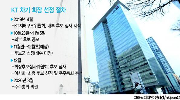 회장후보심사위는 후보를 심사한 후 다시 이사회로 후보자를 넘긴다. 2~3명 가량을 추릴 것으로 예상된다. 마지막으로 이사회가 최종 후보 1인을 결정한 뒤 내년 3월 주주총회에서 이를 의결한다. KT는 연내 회장 후보를 확정한다는 방침이다.