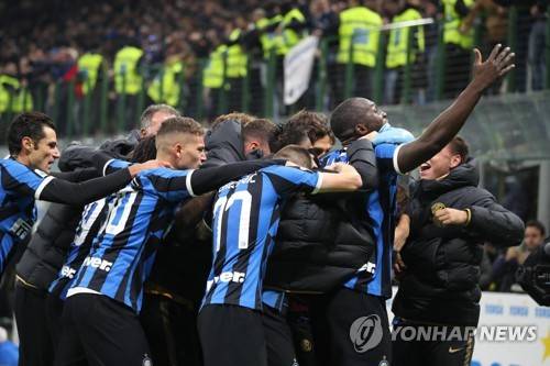 epa07984520 Inter's players celebrate Nicolo Barella's 2-1 goal during the Italian Serie A soccer match FC Inter vs Hellas Verona at the Giuseppe Meazza Stadium in Milan, Italy 9 November 2019. EPA/ROBERTO BREGANI