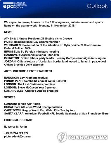 epa07986422 We expect to move pictures on the following news, entertainment and sports items on the epa network - Monday, 11 November 2019: