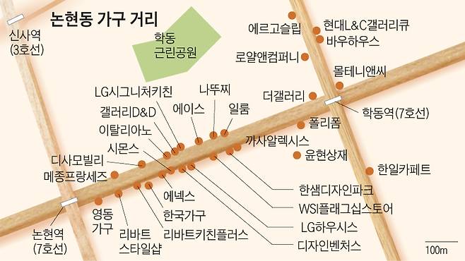 가구업계 관계자는 "2017년만 해도 70여개였던 이 거리의 가구·인테리어 점포가 최근 100개가 넘는다"고 했다. 지난해 한샘 디자인파크와 LG 시그니처키친이 문을 연 데 이어 최근 1년 새 리바트 키친 플러스, 리바트 스타일샵, 이누스바스, 넵스홈 등이 잇따라 개점했다. 펜디까사 등 초고가 해외 브랜드 매장도 문을 열었다. 주요 브랜드 대형 매장이 늘면서 가구거리 판도도 커졌다. 2~3년 전에는 대부분의 점포가 논현역 동편으로 400m 이내 도로변에 밀집돼 있었지만, 최근엔 논현역에서 1㎞ 가까이 떨어진 학동역과 그 주변 도로변으로까지 확대됐다.