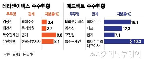 메드팩토는 테라젠이텍스를 비롯해 김성진 대표(12.3%) 등 특수관계인이 40.3%의 지분을 보유 중이다. 다시 말해 테라젠이텍스를 인수하면 메드팩토까지 손에 쥐는 셈이다.