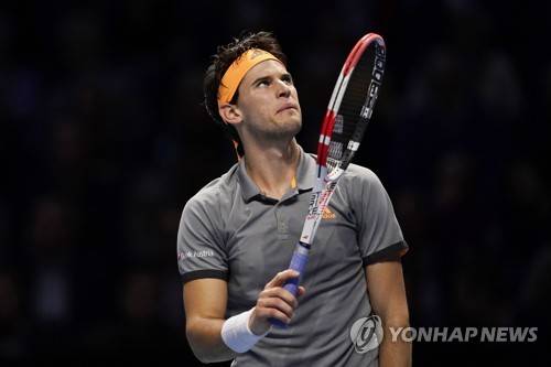 epa07995960 Dominic Thiem of Austria reacts during his round robin match against Matteo Berrettini of Italy at the ATP World Tour Finals tennis tournament in London, Britain, 14 November 2019. EPA/WILL OLIVER