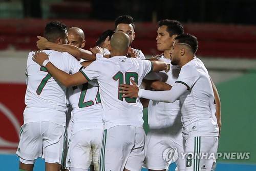 epa07997208 Algeria players celebrate after scoring a goal against Zambia during qualifications match for the 2021 African Cup of Nations soccer tournament, at the Mustapha Tchaker Stadium in Blida, Algeria, 14 Novembre 2019. EPA/STR