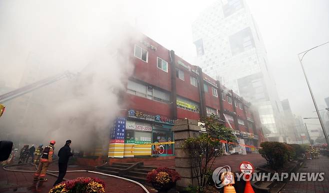 (서울=연합뉴스) 김인철 기자 = 15일 오후 서울 서초구 진흥종합상가에서 불이 나 소방대원들이 화재를 진압하고 있다. 2019.11.15