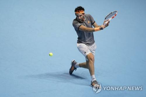 epa08002552 Dominic Thiem of Austria returns to Alexander Zverev of Germany during their mens semi final match at the ATP World Tour Finals tennis tournament in London, Britain, 16 November 2019. EPA/WILL OLIVER