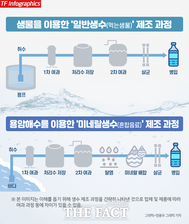 업계에 따르면 생수는 크게 먹는샘물과 혼합음료로 나뉜다. 먹는샘물은 자연상태의 물을 먹을 수 있도록 한 자연샘물로 제주삼다수·백산수·아이시스가 여기에 속한다. 반면 혼합음료는 여과한 정제수에 화학 첨가물 등 기타성분을 넣어 만든 물이다. 두 생수의 관리처도 각각 환경부, 식품의약품안전처로 다르다. 먹는샘물은 '먹는물관리법'에 따라 50가지 수질 검사를 거치며 혼합음료는 '식품위생법'에 따라 위생 검사를 거친다.