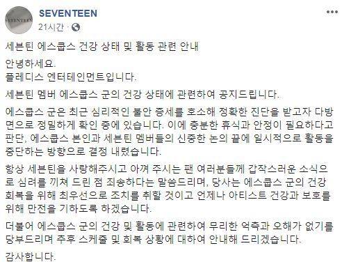 지난 18일 세븐틴의 소속사 플레디스엔터테인먼트(이하 플레디스)는 공식 사회관계망서비스(SNS)를 통해 에스쿱스의 활동 중단 소식을 밝혔다.