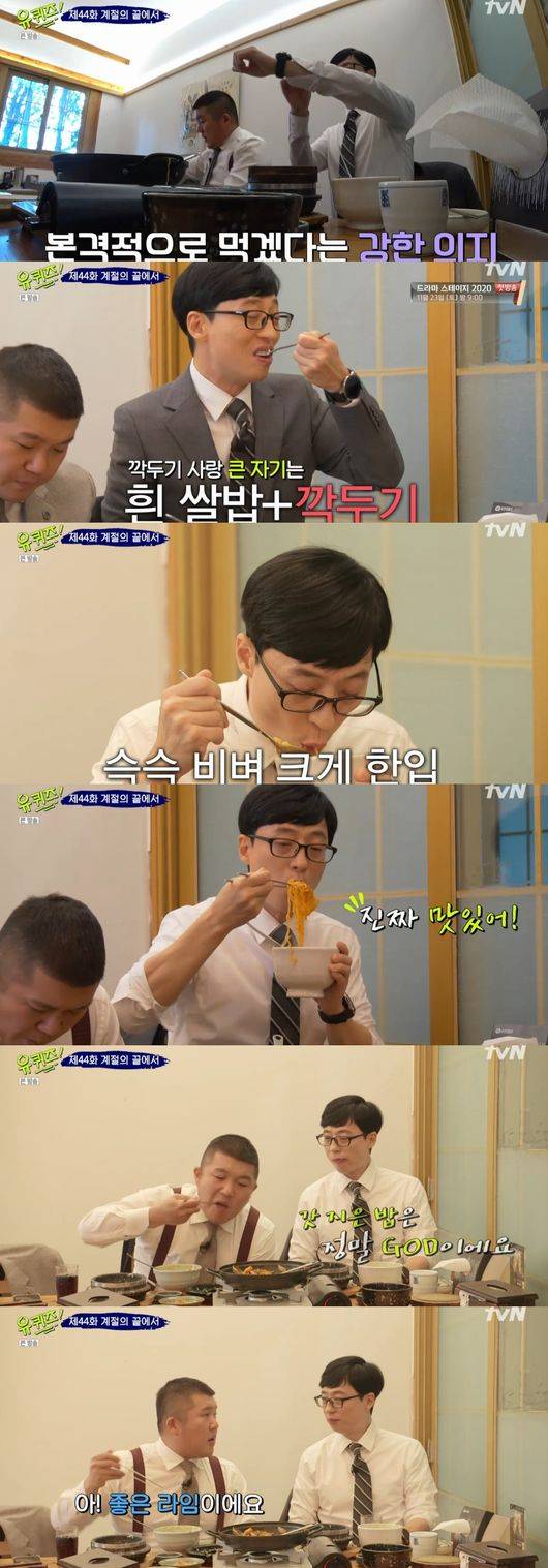 유재석과 조세호는 이천 돌솥밥을 선택, 갓 지은밥에 숭늉까지 두 사람의 식욕을 자극했다. 두 사람은 본격적으로 먹겠다며 겉옷까지 벗어 먹방에 빠졌다. 이어 "핵꿀맛, 진짜 맛있다"며 감탄했다. 마지막은 한국인의 완벽한 디저트인 숭늉으로 식사를 마무리했다. 유재석은 "갓 지은밥은 역시 GOD"이라며 명품 맨트를 남겼다. /ssu0818@osen.co.kr
