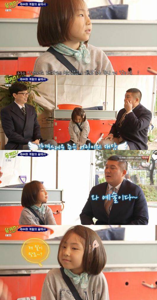 유재석은 포기하지 않으며 "어쩔 수 없지 어른이 되는데 어떤 어른이 되고 싶어요?"라고 질문, 소녀는 "솔직하고 용감하고 착한 어른이 되고 싶다"고 했다. 이에 조세호는 "그럼 아저씨 멋있냐"며 기습 거짓말을 테스트했다. 아이는 "그렇다, 선의의 거짓말"이라며 반전 맨트로 배꼽을 잡았다. 아쉽게 아이는 퀴즈 맞히기 실패했으나 곰돌이 선물로 아쉬움을 대신했다.