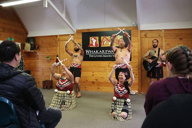 식사를 마치고 마오리족의 민속춤 ‘하카(Haka)’ 관람을 위해 공연장으로 향한다. 마오리 족장이 관객들을 맞이하며 이마와 코를 2번 맞댄다. 마오리족의 인사법 ‘홍이’다. 만약 실수로 3번을 부딪혔다면 그것은 청혼을 뜻하니 잘못된 만남을 원치 않는다면 서둘러 4번 이상을 부딪쳐 존경을 표해야 한다.