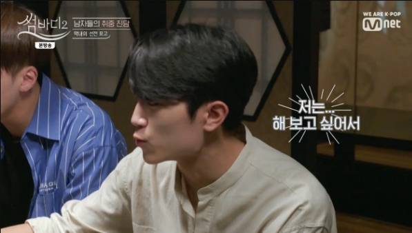 남자들은 함께 술자리를 가졌다. 이우태는” 혜수와 키스신 찍을 때 용기를 못냈는데 (재엽)형은 10초 동안 입술을 대고 있더라”고 질투했던 마음을 털어놨다. 이에 재엽은 “솔직히 혜수가 더 리드한거야”라고 답했다. 장준혁은 “도윤이 형이 단체뮤비 때 예림이 누나를 선택하면서 ‘나는 이제 100%로 썸에 임할거야’라고 했다. 그때 선전포고를 하는 것 같았다. 그래서 불편해진 게 있다”고 속마음을 밝혔다. 이어 "데이트해보고 싶은 다른 사람이 있냐"고 묻더니 "나는 혜수 누나와 해보고 싶다. 처음부터 궁금했다"고 말해 모두를 놀라게 했다.(사진=Mnet ‘썸바디2’캡처)