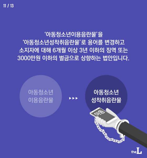 ‘아동청소년이용음란물’을 ‘아동청소년성착취음란물’로 용어를 변경하고 소지자에 대해 6개월 이상 3년 이하의 징역 또는 3000만원 이하의 벌금으로 상향하는 법안입니다.