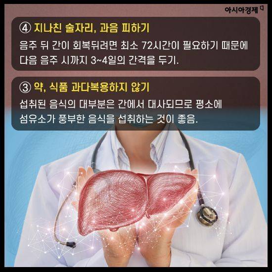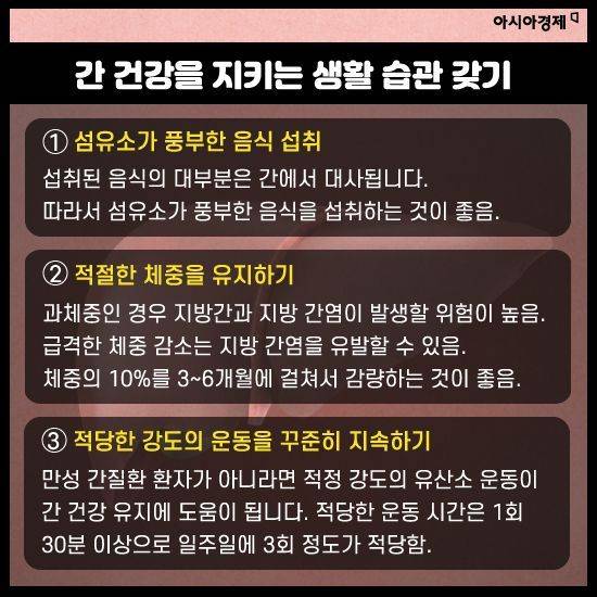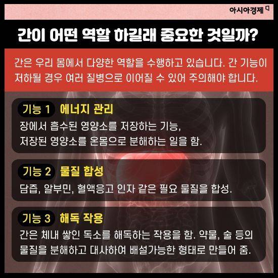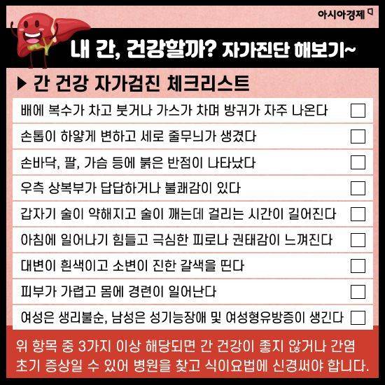 [아시아경제 이진경 기자] 평소 간 건강 잘 챙기고 있나요? 간은 다른 기관과는 다르게 통증에 무뎌 조용히 병드는 ‘침묵의 장기’로 알려져 있습니다. 따라서 간이 안 좋다고 느끼고 나면 이미 증상이 꽤 진행된 경우가 많아 꾸준히 간 건강에 신경쓰는 것이 중요합니다. 자가진단을 통해 간의 건강 상태를 살펴보고 간에 좋은 음식부터 일상에서 할 수 있는 간 건강 관리 방법까지 함께 알아봅시다.