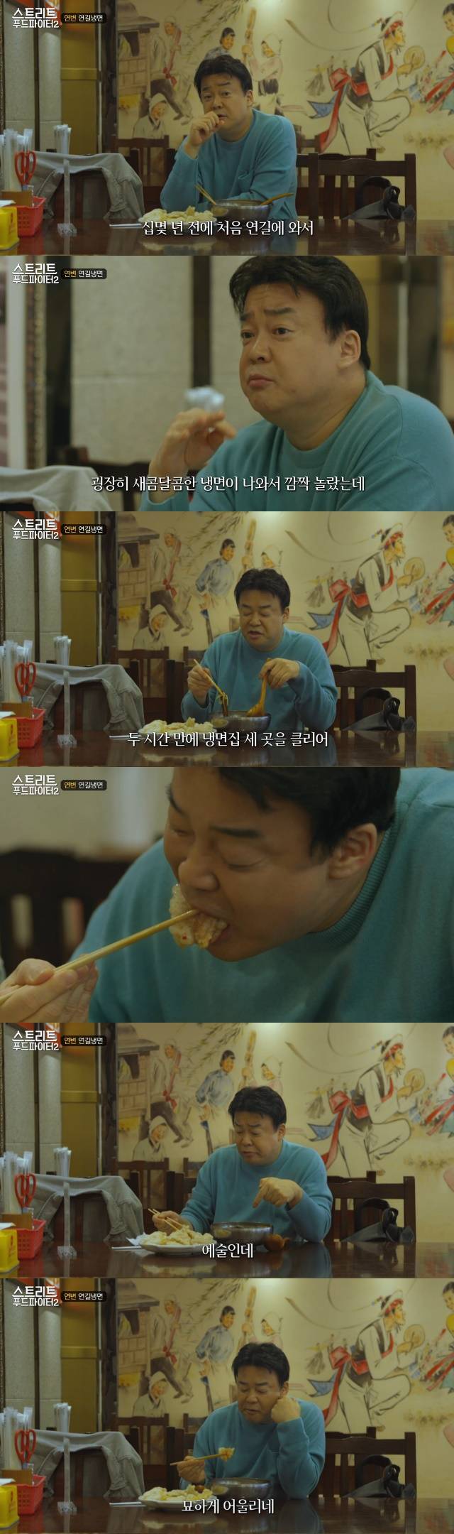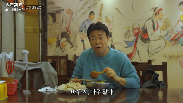 음식이 나오자 백종원은 "연길냉면은 국자를 준다. 육수부터 먼저 먹으라는 거다"라며 연이어 국물을 세 번을 들이켰다.