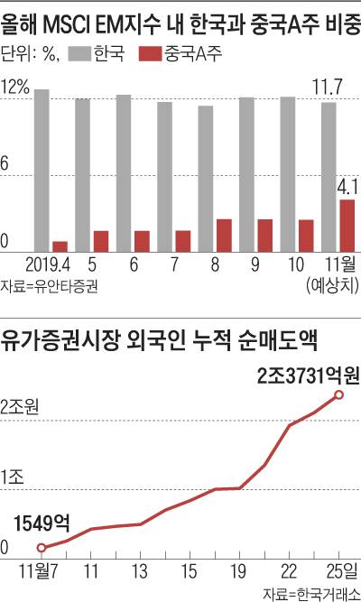 작년 5월 이전엔 MSCI EM 지수에 편입된 중국 주식은 홍콩과 미국 등에 상장된 중국 회사밖에 없었다. 그런데 MSCI는 작년 5월부터 중국 A주를 MSCI EM 지수에 편입하기 시작했고, 그 비율을 점차 늘려왔다. MSCI EM 지수 내 비율이 바뀌면 이를 추종하는 자금이 이동한다. 중국 A주의 비율이 늘고 한국 등 다른 나라 주식 비율이 줄면 이에 맞춰 MSCI EM 지수를 추종하는 글로벌 자금이 중국 A주를 사고, 한국 등 다른 나라 주식은 파는 것이다. 문제는 이 지수를 추종하는 자금이 1조6000억달러(약 1880조원)에 이르는 거액이라는 데 있다. 송승연 한국투자증권 연구원은 "11월 MSCI EM 지수 재조정으로 유출될 자금 규모는 1조5000억원에서 2조5000억원이 될 전망"이라면서 "(지수 조정이 마무리되는) 26일까지는 외국인 자금 유출이 지속될 것"이라고 했다.