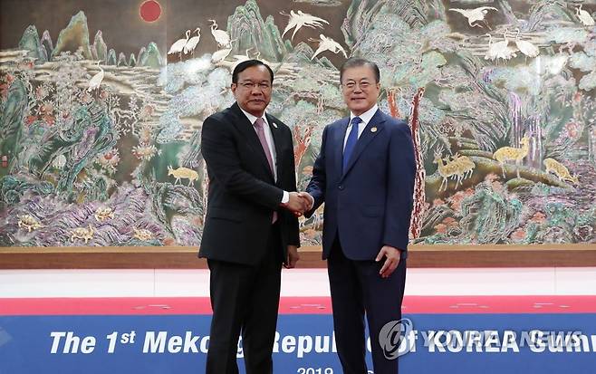 (부산=연합뉴스) 이진욱 기자 = 문재인 대통령이 27일 오전 부산 누리마루에서 제1차 한·메콩 정상회의에 참석하는 프락 속혼 캄보디아 부총리 겸 외교부 장관을 영접하고 있다. 2019.11.27