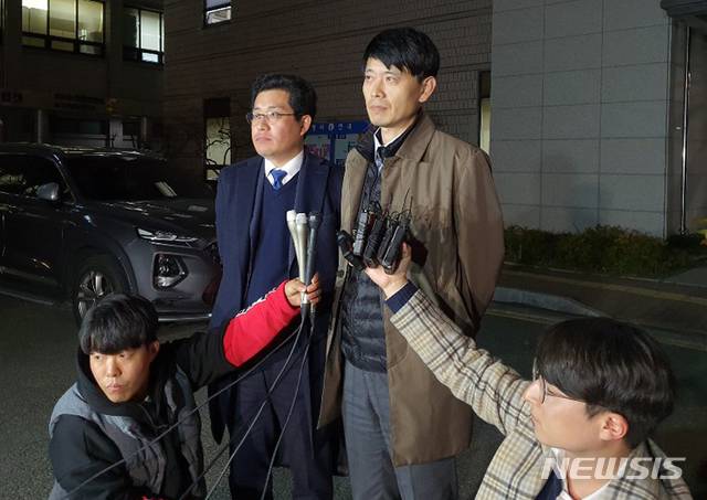 [창원=뉴시스] 강경국 기자 = 진주 아파트 방화·살인 사건의 피고인 안인득(42)에 대한 국민참여재판에서 사형이 선고된 가운데 문일환 변호사 등 안인득의 변호인들이 법정 앞에서 기자들의 질문에 답을 하고 있다. 2019.11.27.