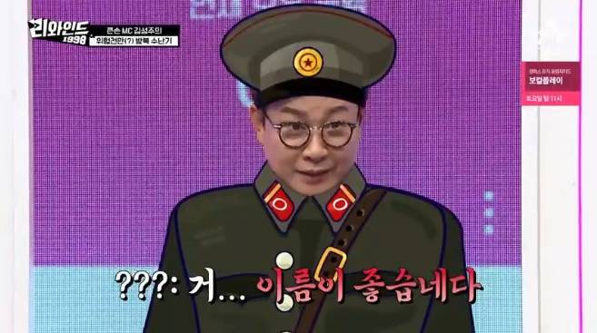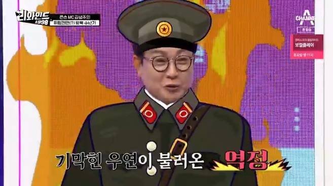 또 김성주는 "제 뒤에 매니저가 왔는데, 그 친구 이름이 박장군이다. 매니저의 이름을 보고는 '장난합네까? 진짜 이름 맞습네까? 어디 장군님 이름을 씁네까?'라고 하더라. 굉장히 어렵게 넘어갔었다"고 털어놨다.(사진=채널A '리와인드' 캡처)