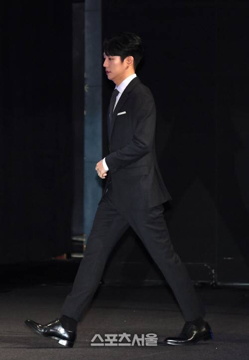 배우 정해인이 28일 오전 서울 강남구 압구정CGV에서 진행된 영화 '시동' 제작보고회에서 무대로 입장하고 있다.
