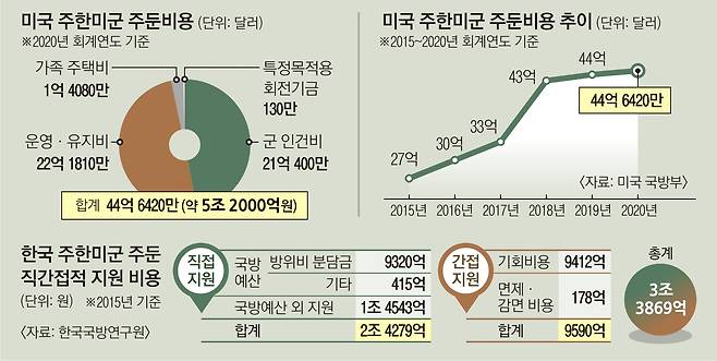하지만 한국은 미국에 실제 현금·현물로 지불하는 방위비 분담금 외에도 추가로 주한미군 주둔의 직간접적 지원 비용을 지불하고 있다. 한국국방연구원에 따르면 2015년 한국이 직간접적으로 지원한 주한미군 주둔비용은 당시 방위비 분담금 9320억원을 포함해 3조 3869억원이다. 이는 2015 회계연도에 미국이 지출한 주한미군 주둔비용 약 27억 달러(약 3조 1800억원)를 넘어서는 수치로, 이미 한국은 5년 전부터 미국이 지출하는 주한미군 주둔비용에 육박하는 금액을 직간접적으로 지원한 셈이다. 최강 아산정책연구원 부원장은 “트럼프 대통령이 동맹국을 돈으로 매도하며 동맹 흔들기에 나서는 만큼 우리도 강경한 입장을 취해야 한다”며 “분담금을 5배 올리느니 그 돈으로 자주국방을 하겠다는 식으로 대응하며 트럼프 대통령의 무리한 요구에 맞서야 한다”고 했다.
