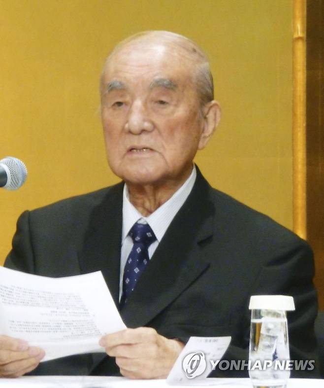 (도쿄 교도=연합뉴스) 일본 현대 정치사의 산증인인 나카소네 야스히로(中曾根康弘) 전 일본 총리가 20일 별세했다. 향년 101세. 사진은 2018년 7월 도쿄 한 호텔에서 열린 젊은 연구자에 대한 시상식에서 인사말을 하는 나카소네 전 총리. 2019.11.29