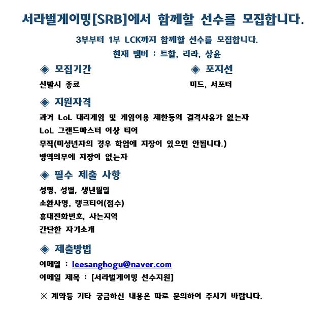 이상호는 2일 아프리카TV 개인방송을 통해 "서라벌게이밍(SRB)을 창단하고 3부 리그에 도전할 계획"이라며 "3부 리그를 통과하고 챌린저스를 거쳐 LCK 진출까지 노려볼 예정"이라고 말했다.